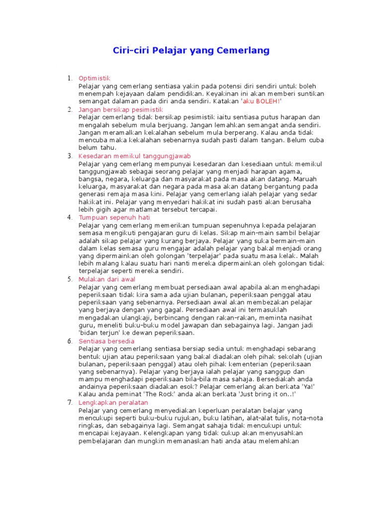 Contoh Karangan Ciri-Ciri Pelajar Cemerlang.